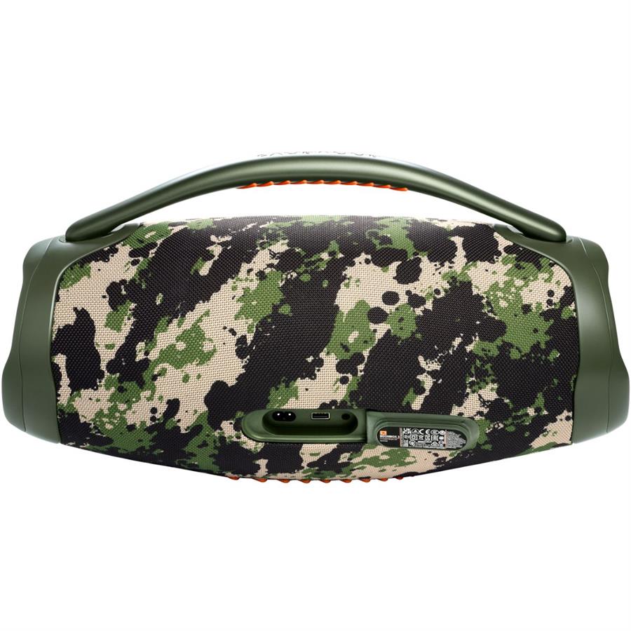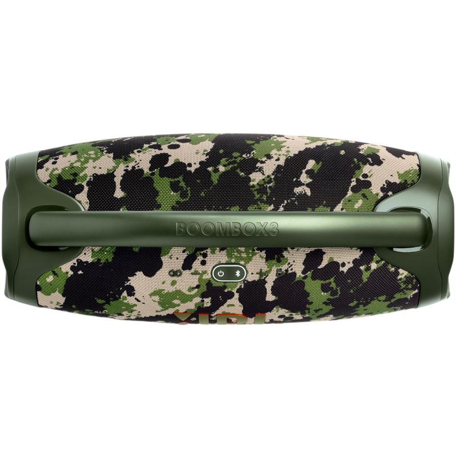 Hemos mejorado aún más nuestro altavoz Bluetooth portátil más potente. La icónica silueta del JBL Boombox 3 presenta una nueva y atrevida versión con un resistente asa de metal y empuñaduras de silicona, dos tapas laterales y un tejido resistente al agua y al polvo. También se ha rediseñado el interior, con un nuevo subwoofer que ofrece graves mucho más profundos y el arrollador JBL Original Pro Sound, todo ello con menor distorsión. Gracias a las 24 horas de tiempo de reproducción, podrá acompañarte desde el entrenamiento de la mañana hasta la cita nocturna con tus amigos. Y para disfrutar de un sonido prácticamente ilimitado, puedes conectar varios altavoces con la aplicación JBL Portable.